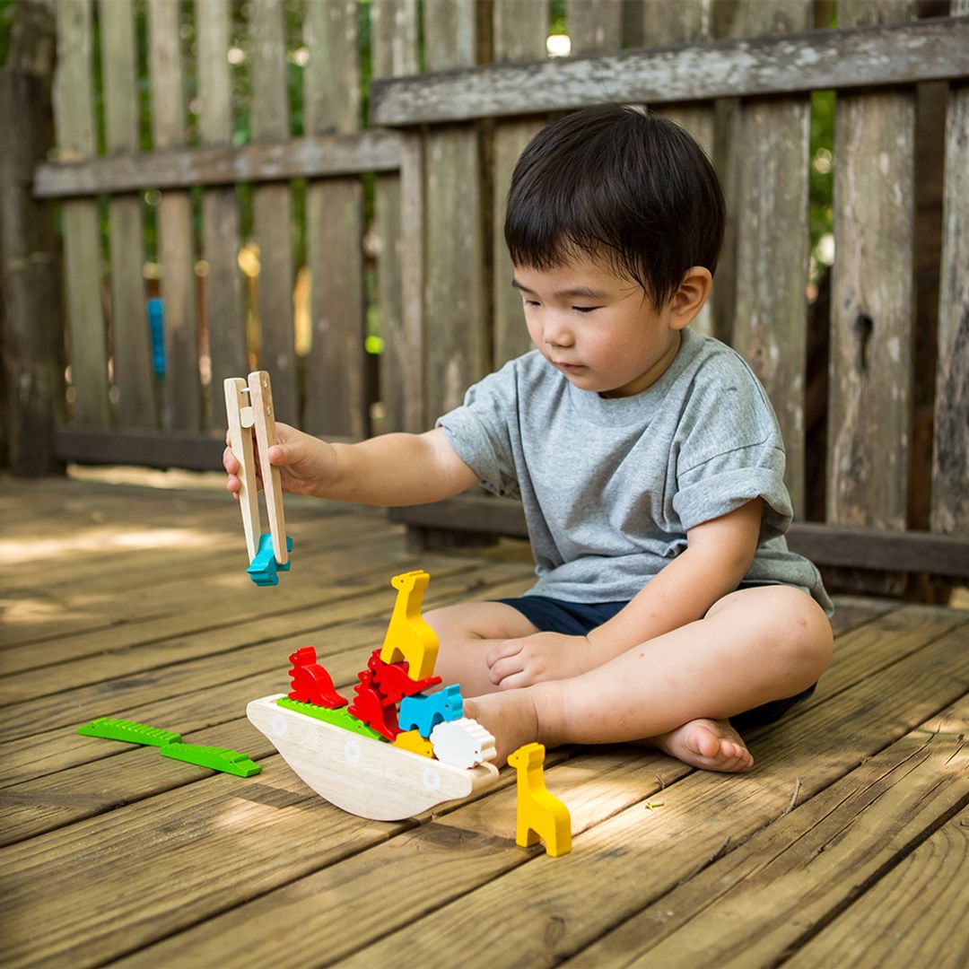 - Roll the dice and select an animal with the same color to balance on the boat. Be sure to strategically place the animals so they stay balanced!