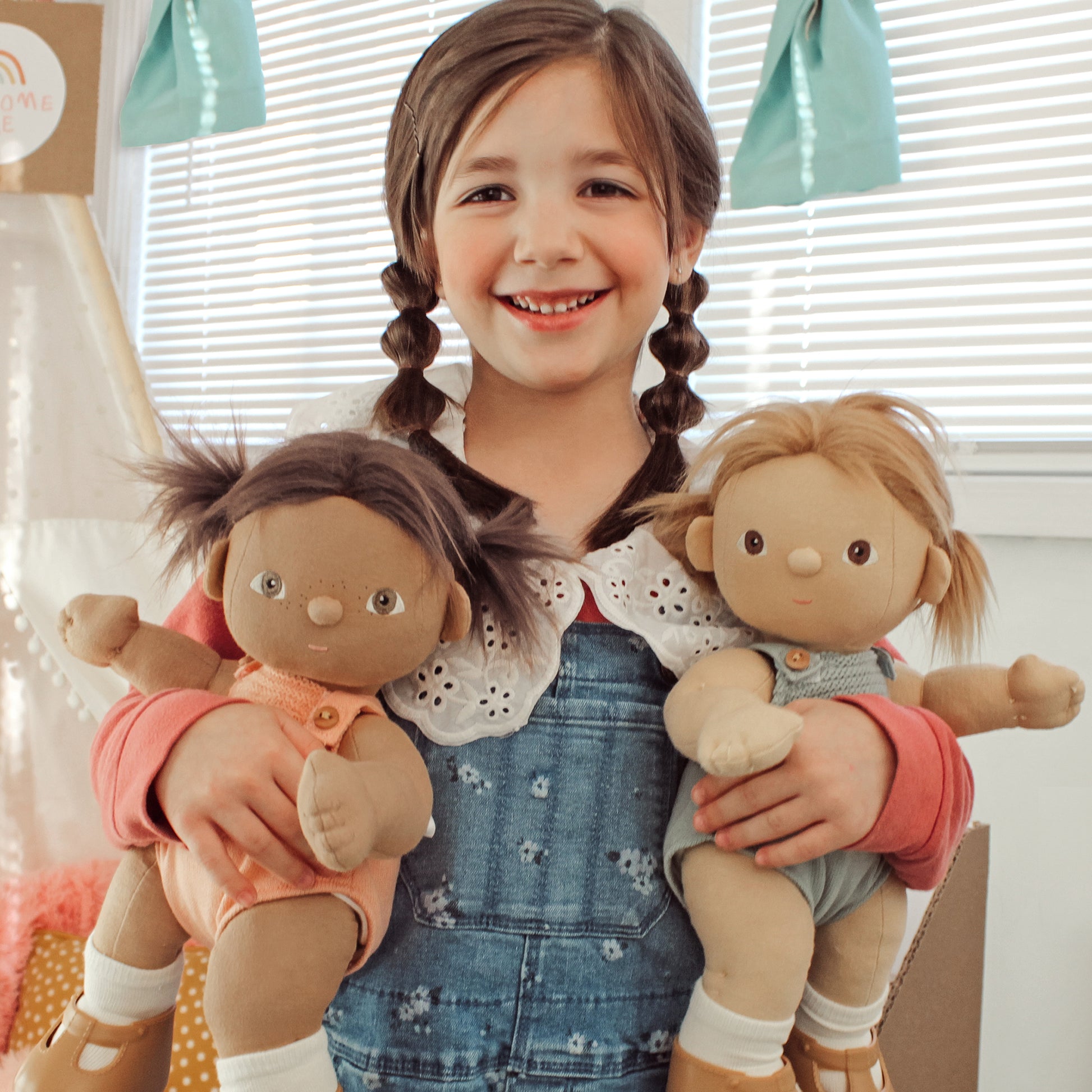 It's not just Dottie’s soft and snuggly body that make her the perfect doll-mate. With her cosy cotton body and soft brown hair, she’s simply made for cuddles. Snuggly, sweet, and always ready for fun, Dottie is dressed to charm in a pink romper with teeny wooden buttons and easy velcro fastenings for little hands. Whether it’s a nap, a tea party, or a grand adventure, Dottie’s ready to tag along and be your little one’s forever friend.