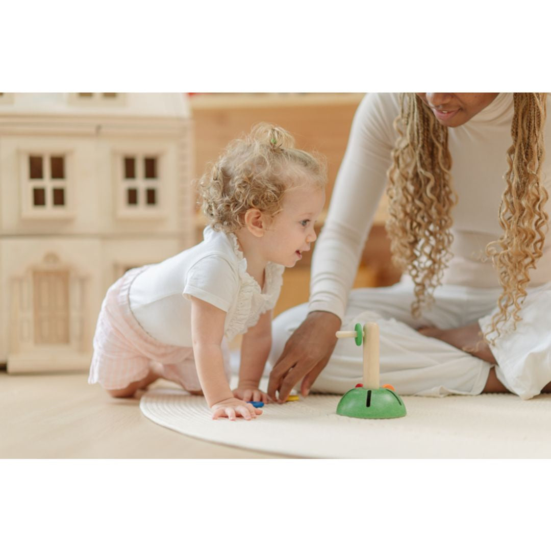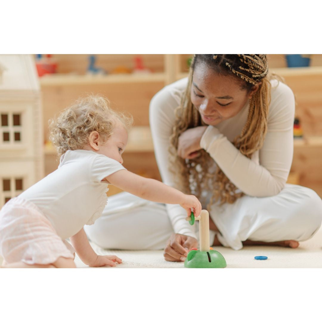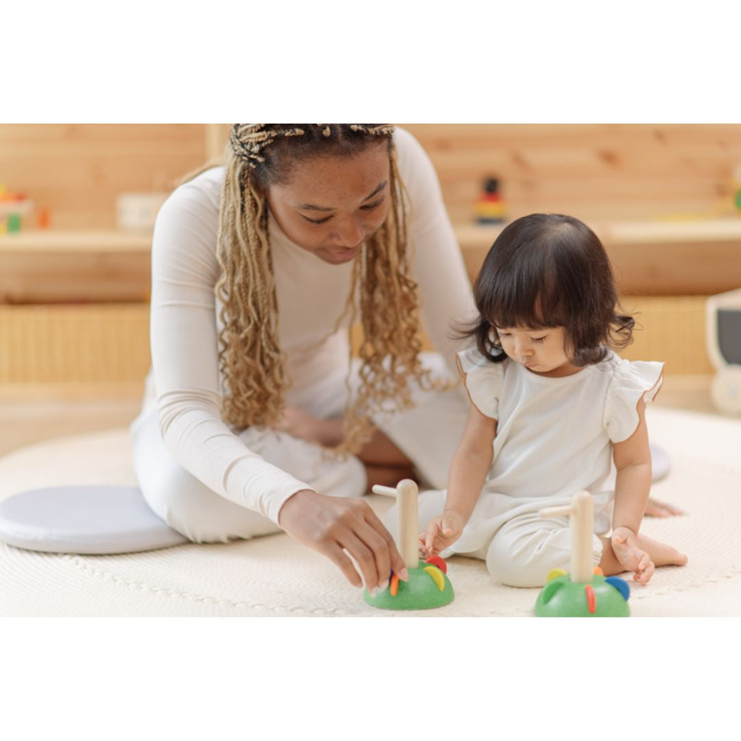 - Sustainably made in Thailand using chemical-free rubberwood, non-toxic glue, organic pigments, and water-based dyes. Set Includes: 1 wooden base with a post and 5 colorful rings.