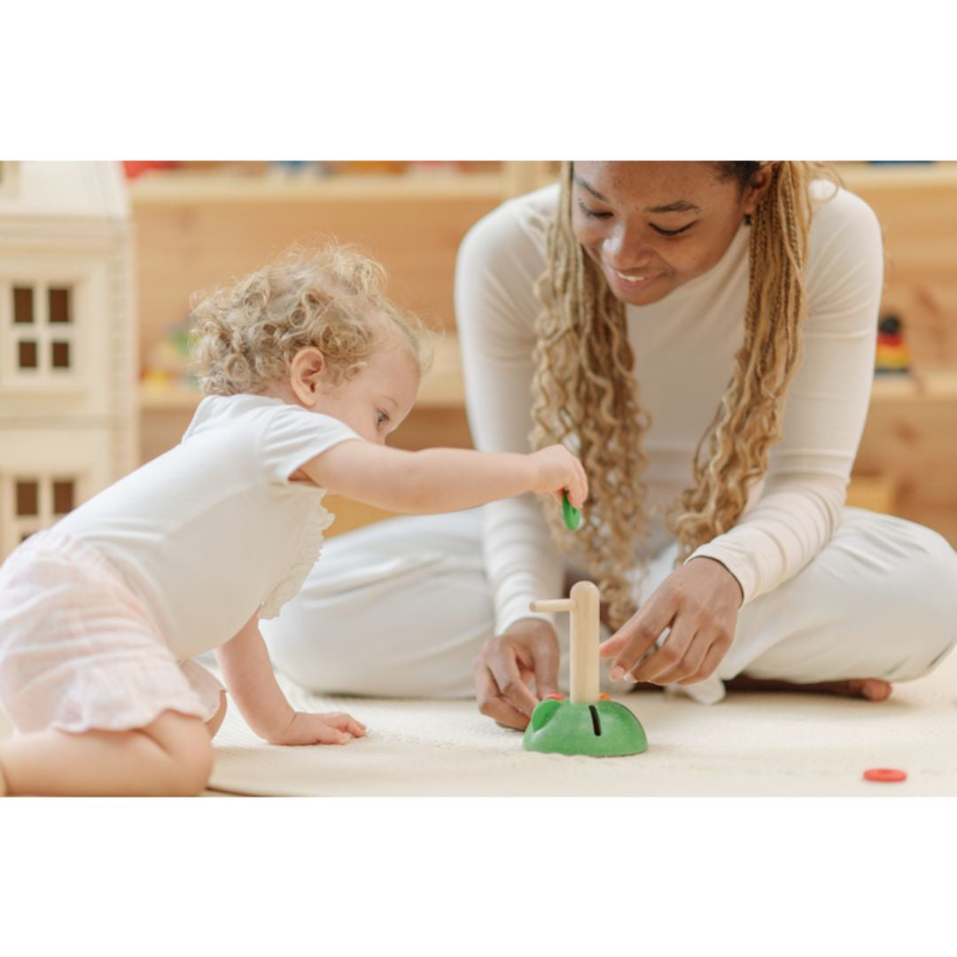 "This unique stacking toy challenges children to interact with traditional stackers in a new way. Featuring a horizontal stacker rod, it helps refine hand movements, wrist rotation, and coordination. The base includes a coin slot for added engagement, strengthening fine motor skills and hand-eye coordination. Children remove the rings and thread them onto the horizontal post, improving finger control and bilateral hand use. Once completed, they can slide the rings off and drop them into the base’s storage slot, reinforcing problem-solving and cognitive development. This activity promotes grip adjustment, cross-body movement, and early concepts of counting, direction, and sequencing, stimulating both brain hemispheres for balanced coordination. Set includes: 1 wooden base with a post and 5 colorful rings."