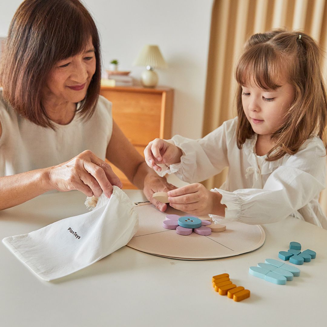 Relax and meditate with PlanToys Mandala. Begin by arranging the pieces from the center and gradually expanding the radius. Players can choose whether to create designs and patterns independently or follow the instructions provided. This activity can help improve concentration, decision-making, visual perception, and hand-eye coordination. The mandala includes 60 pieces in a variety of shapes and sizes, 1 circular cloth sheet, and a cloth bag for storage.