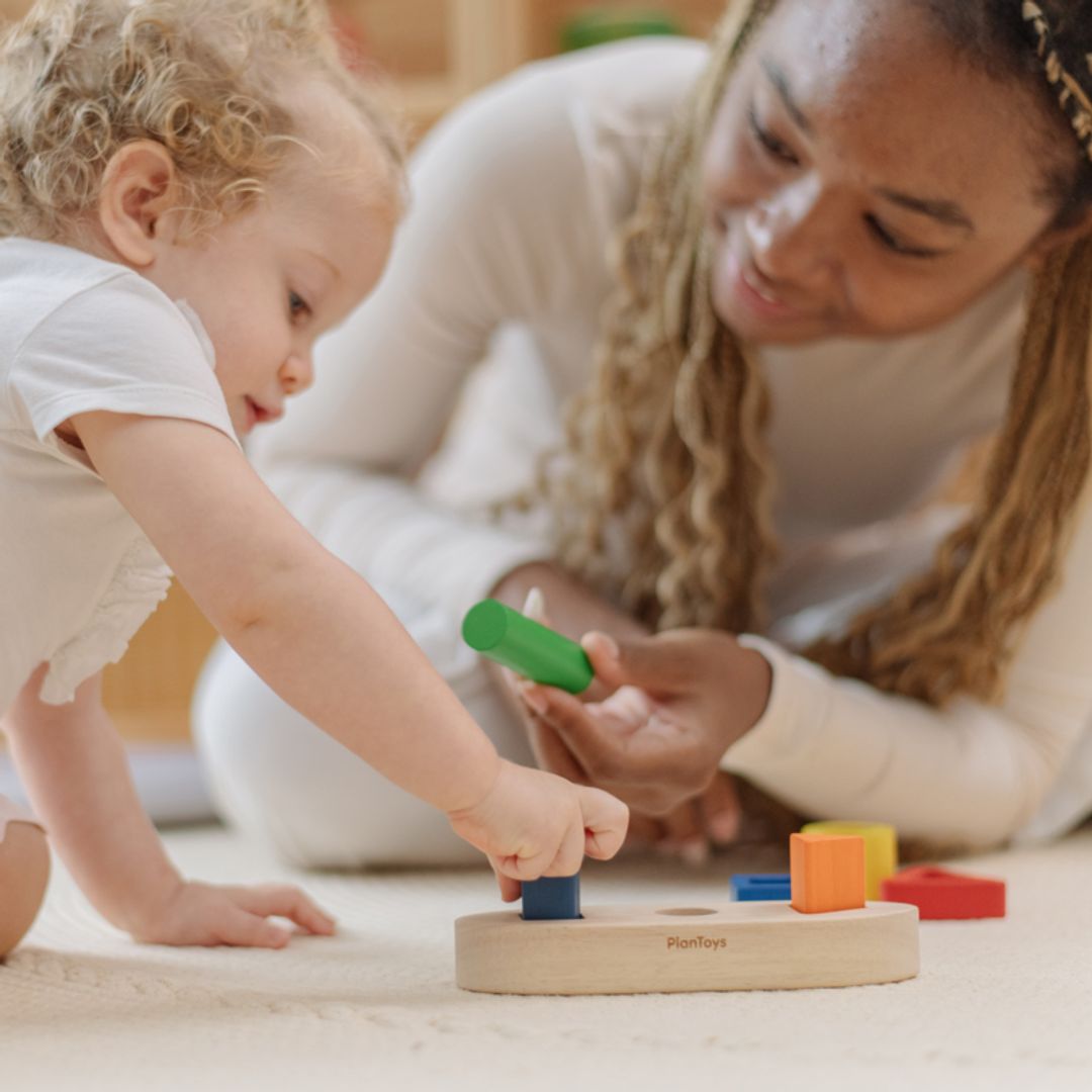 - Sustainably made in Thailand using chemical-free rubberwood, non-toxic glue, and water-based dyes. Set Includes: 1 base, 6 blocks: solid (orange, green, blue) & hollow (red, yellow, light blue), in matching shapes.